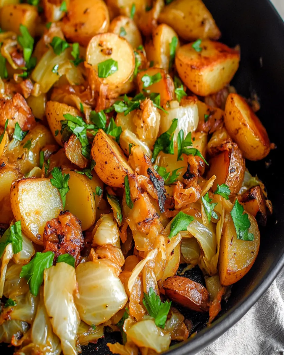 A delicious and hearty skillet dish featuring tender cabbage and crispy potatoes, perfect for a quick weeknight meal.