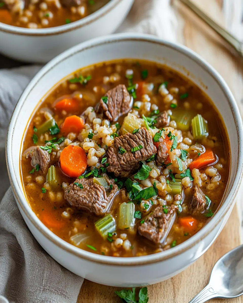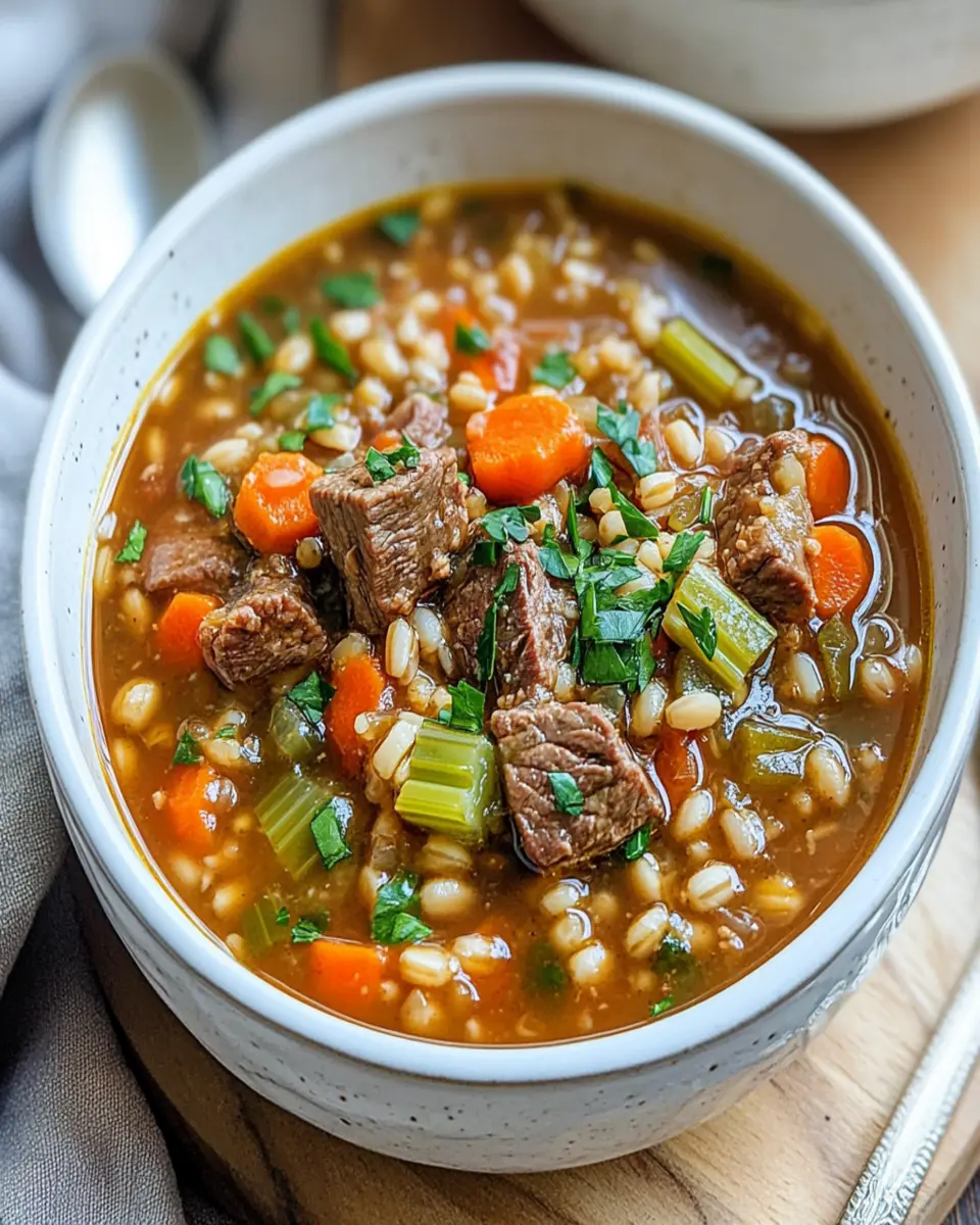 A hearty and nutritious soup loaded with beef, barley, and vegetables.