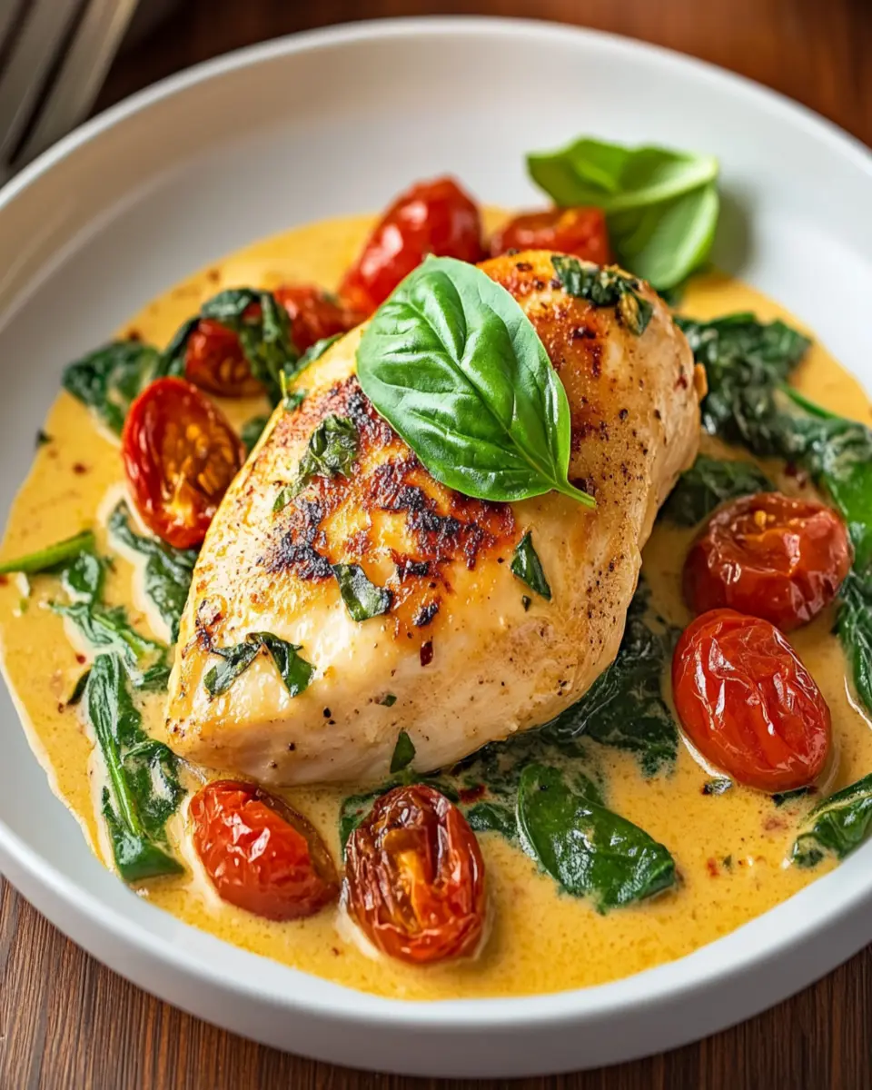 This Creamy Tuscan Chicken features succulent chicken breasts in a rich and creamy garlic sauce with sun-dried tomatoes and spinach. Perfect for a cozy dinner!