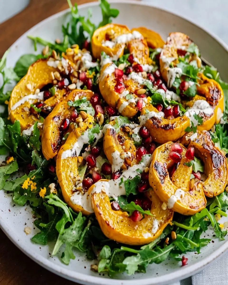 This Delicata Squash Salad with Tahini Dressing is a delicious and nutritious vegetarian dish that combines roasted delicata squash, fresh greens, and a creamy tahini dressing.
