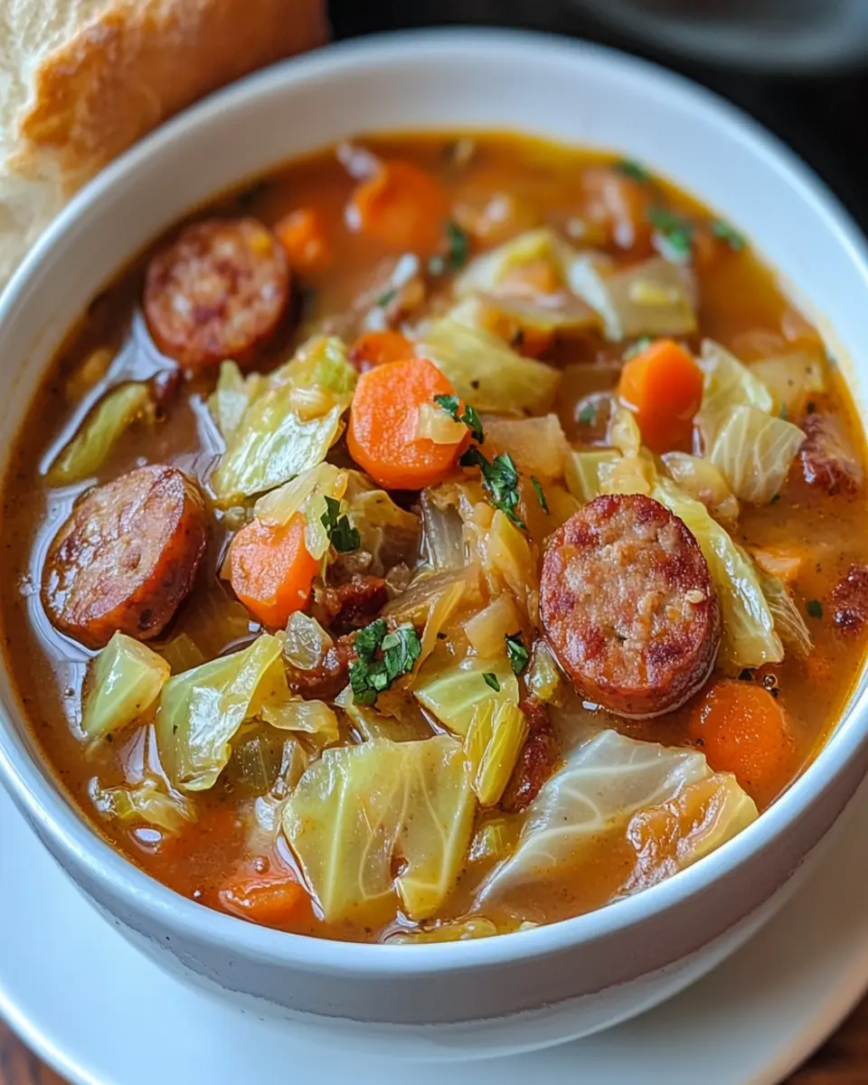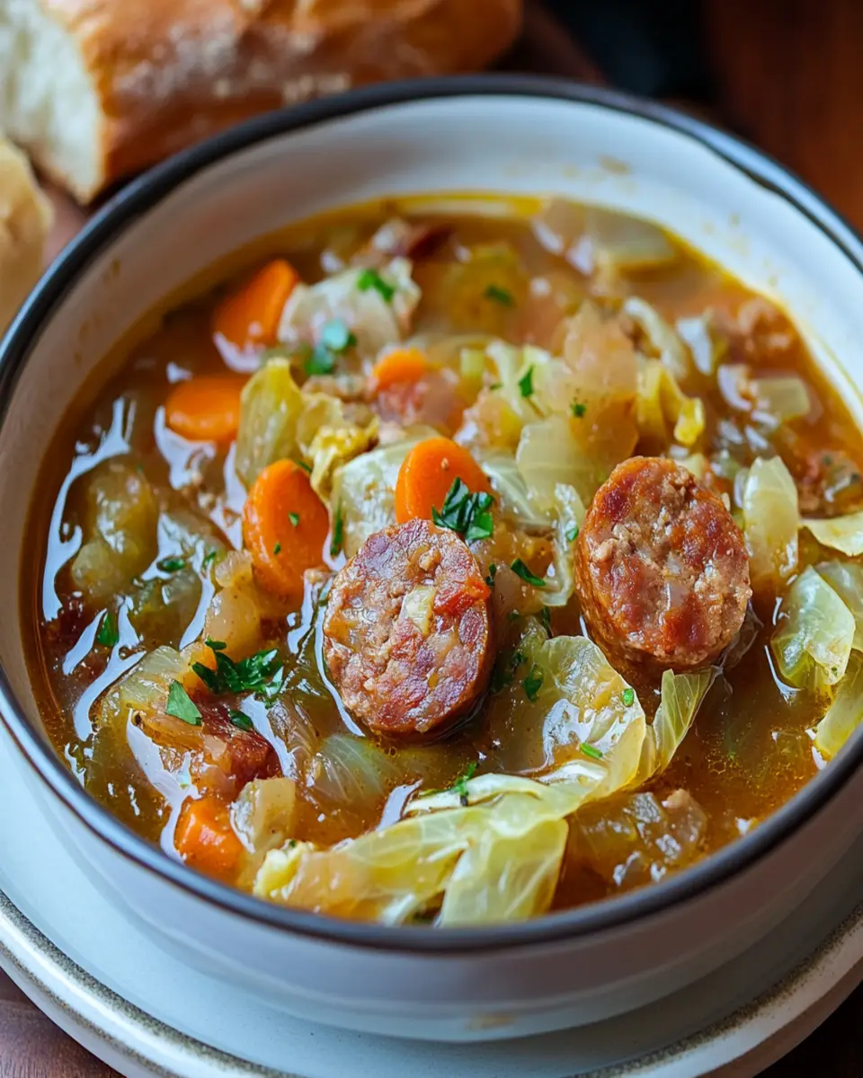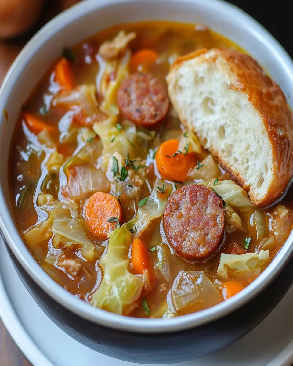 A hearty and comforting soup made with cabbage, sausage, and a blend of savory spices.